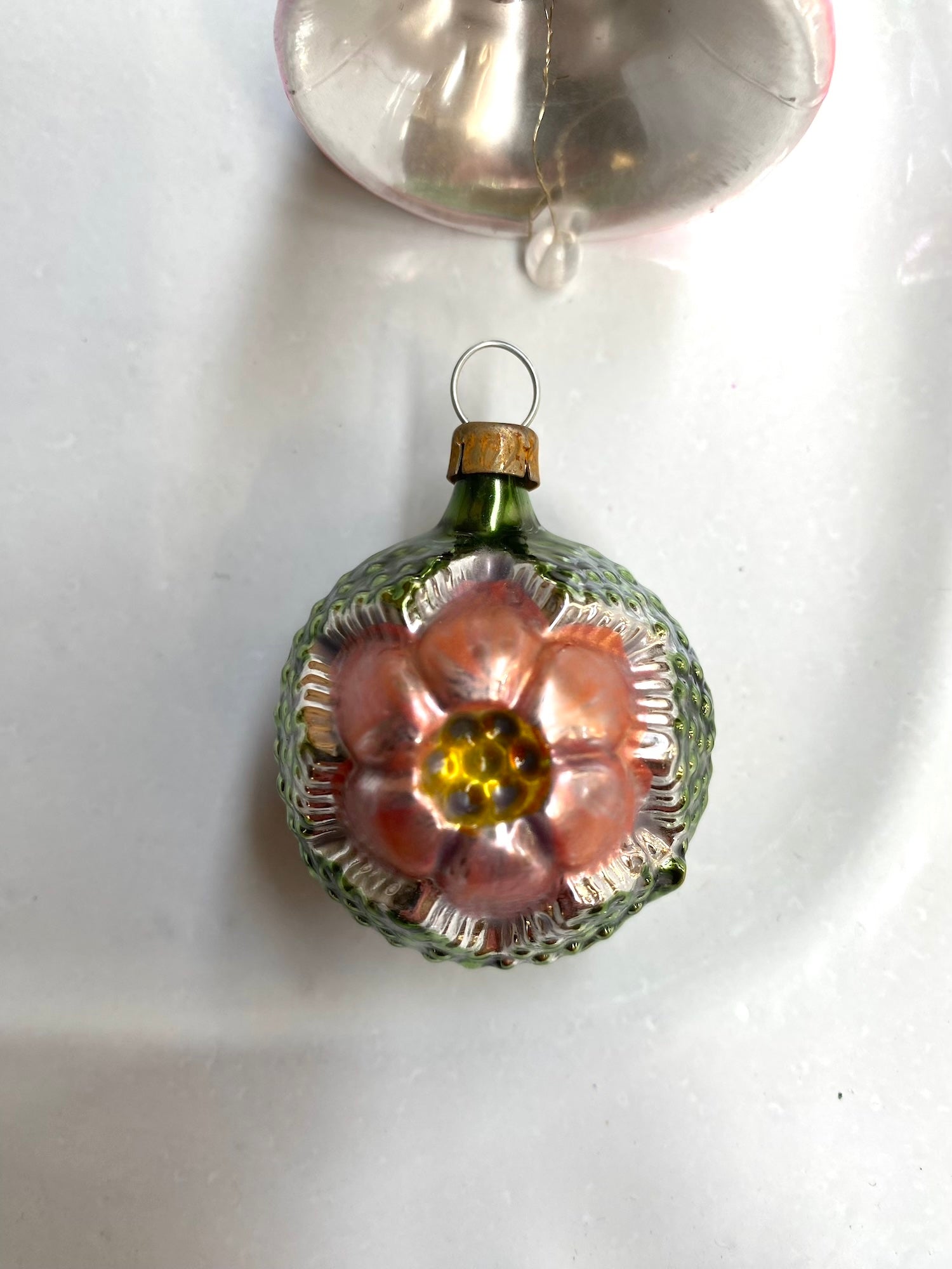Pink Butterfly Bell & Flower - Pair of Nostalgic German Christmas Ornaments. Set of 2 ornaments.