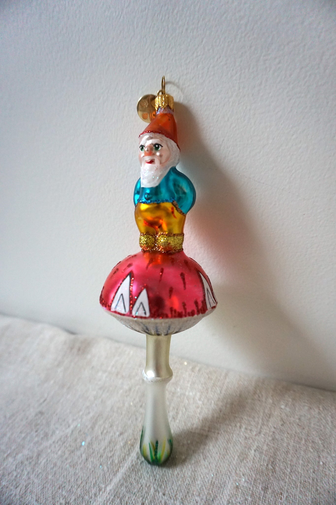 Polish Glass Christmas Ornament - Blue & Yellow Gnome on Mushroom