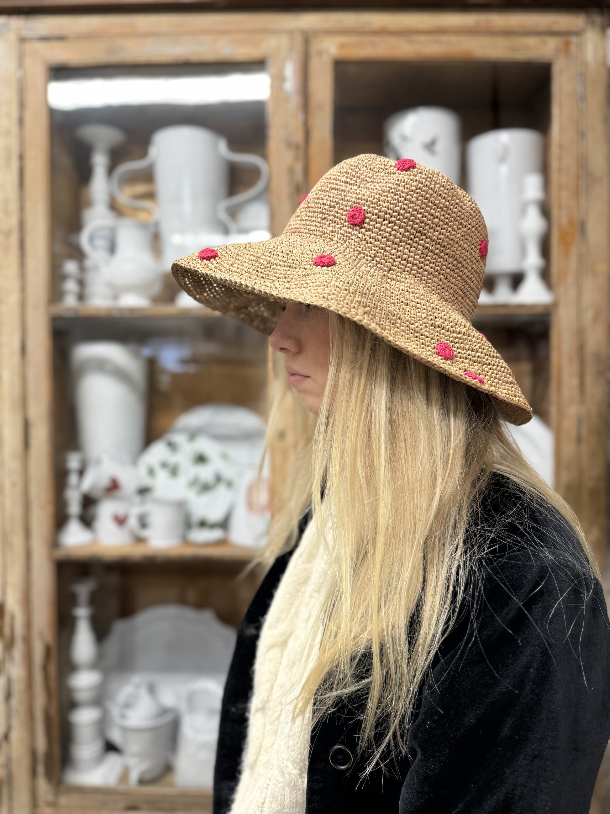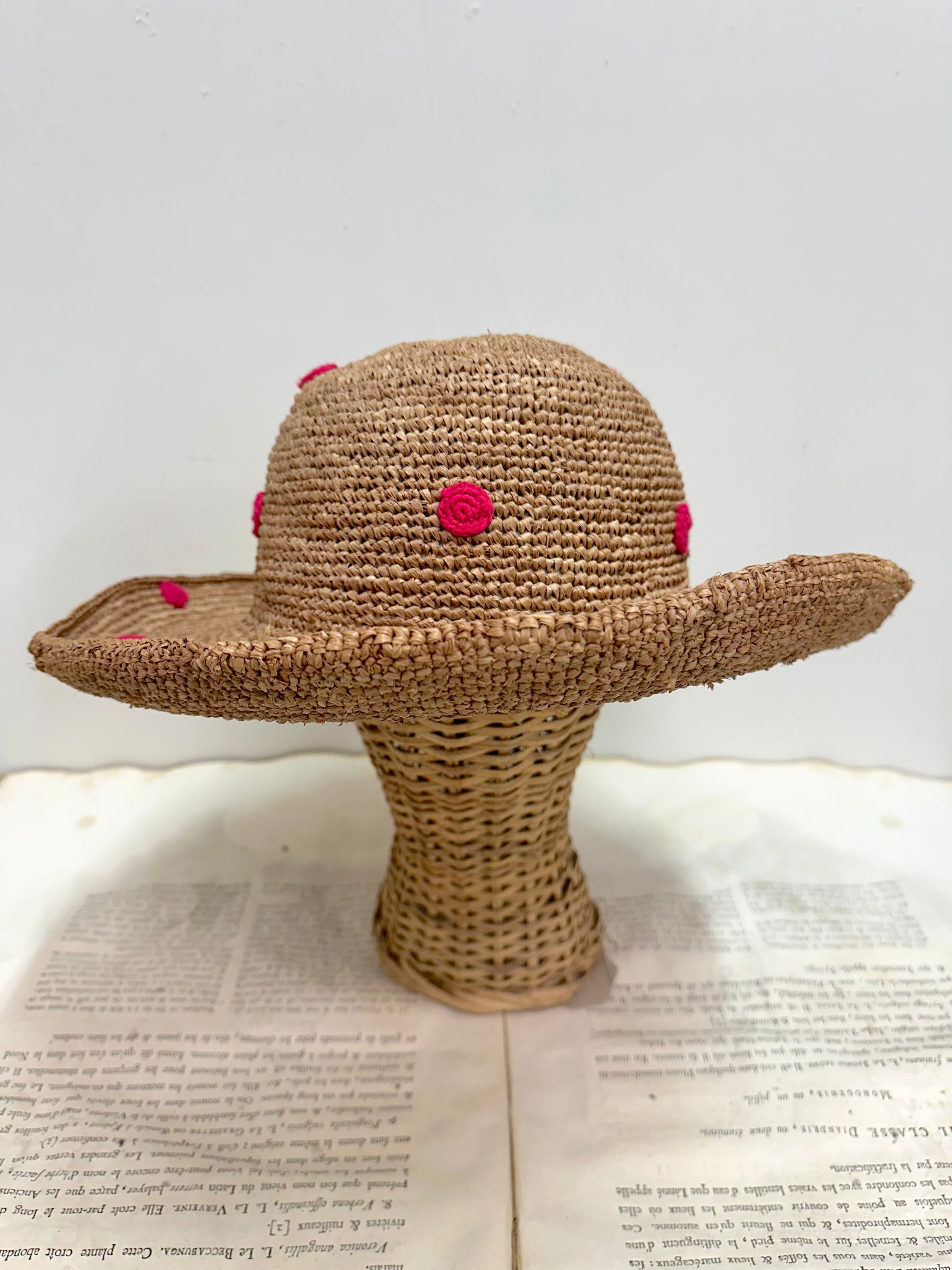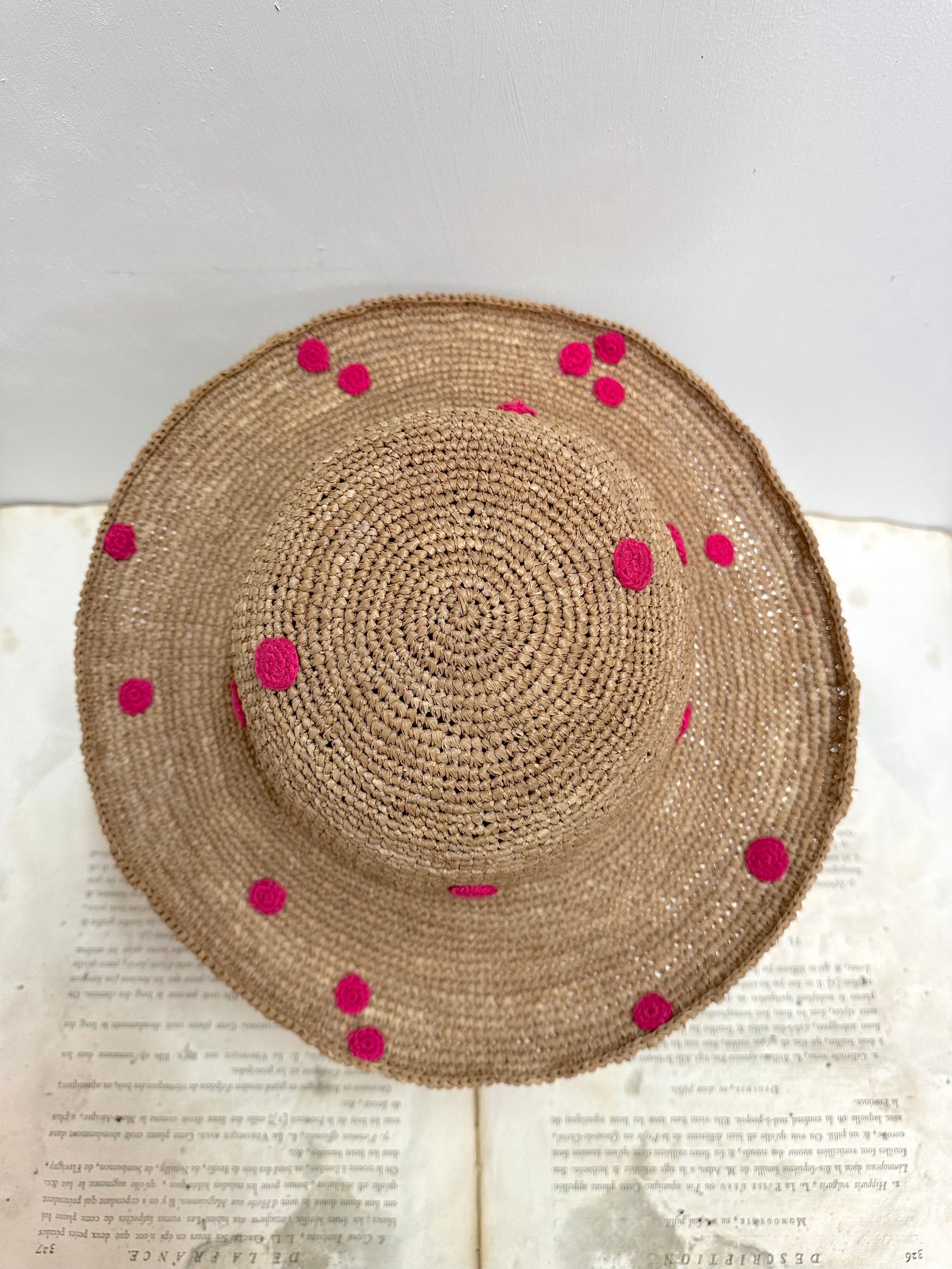 Large woven Raffia hat with small pink crocheted spots.