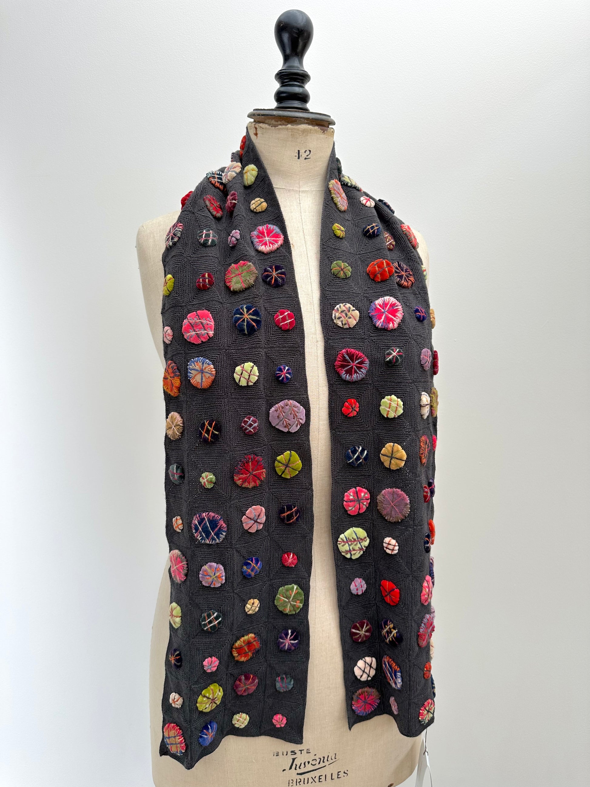 Sophie Digard Crochet Wool Scarf. Beautiful multi-colour velvet circles with bright detailed stitching designs in shades of pink, blue, purple, green and more, on a dark grey check background.