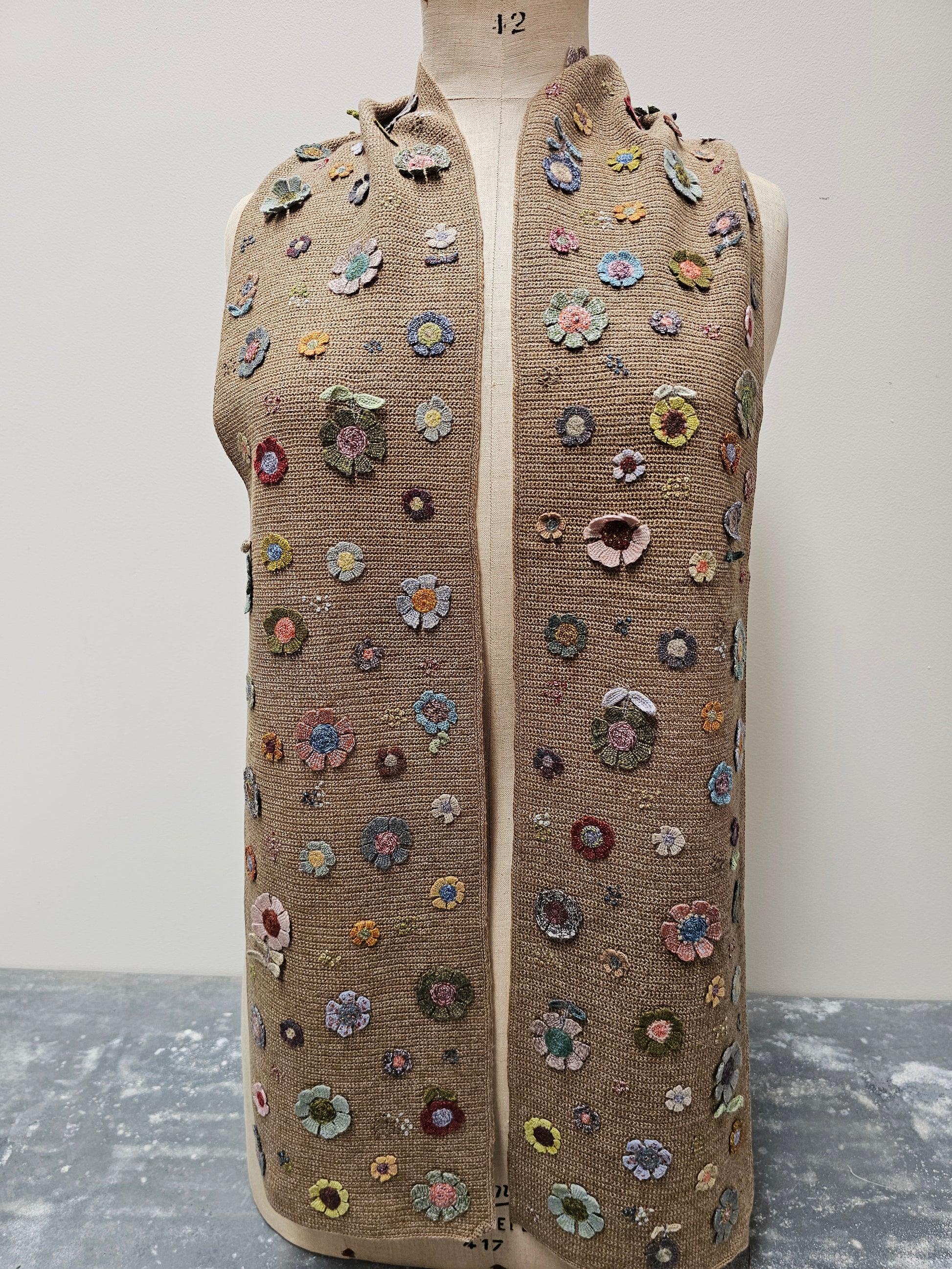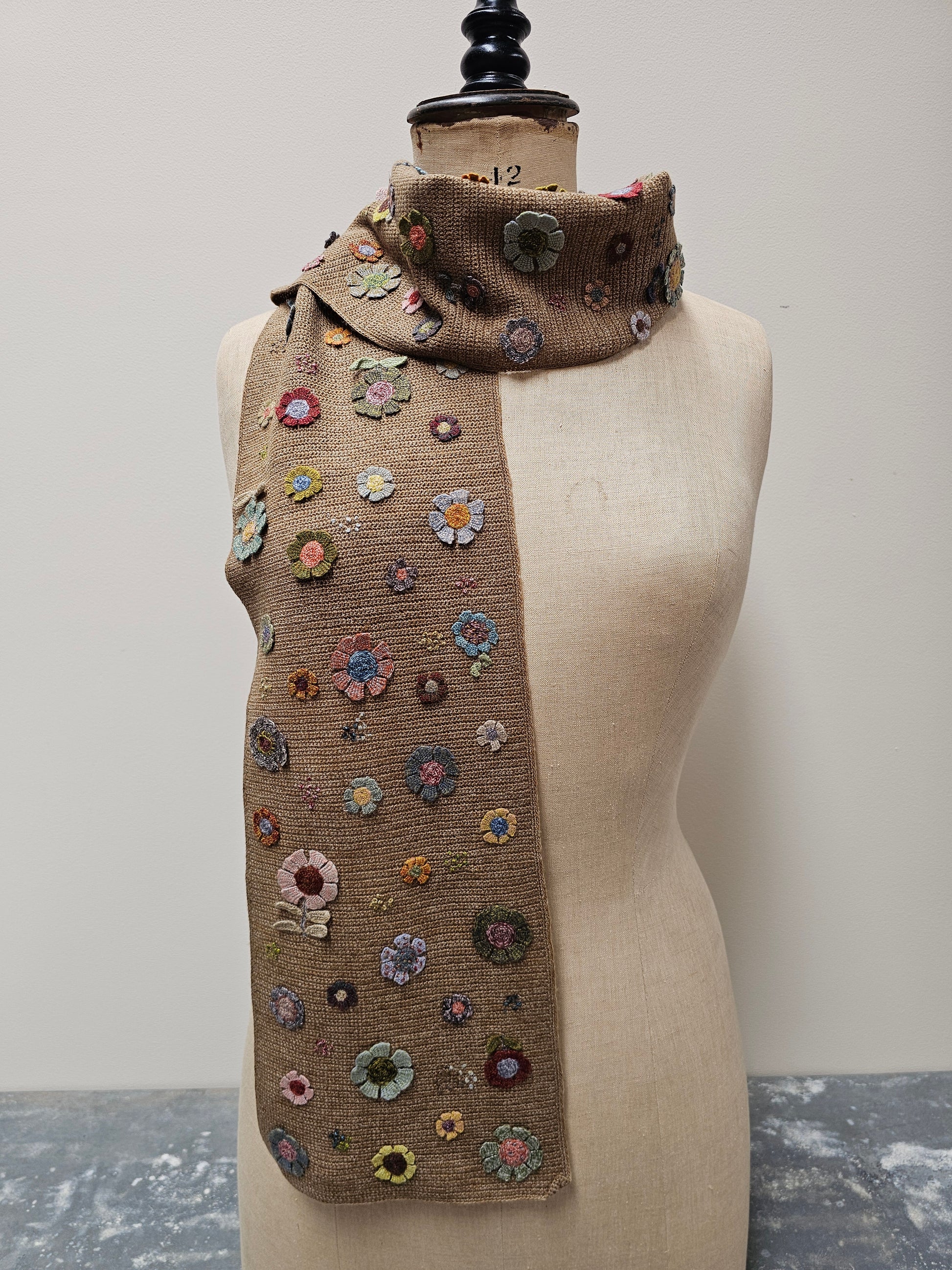 Sophie Digard Floral Ochre Crochet Wool Scarf. Beautiful multi-colour design with applique crochet flowers, on a latte marle wool background.