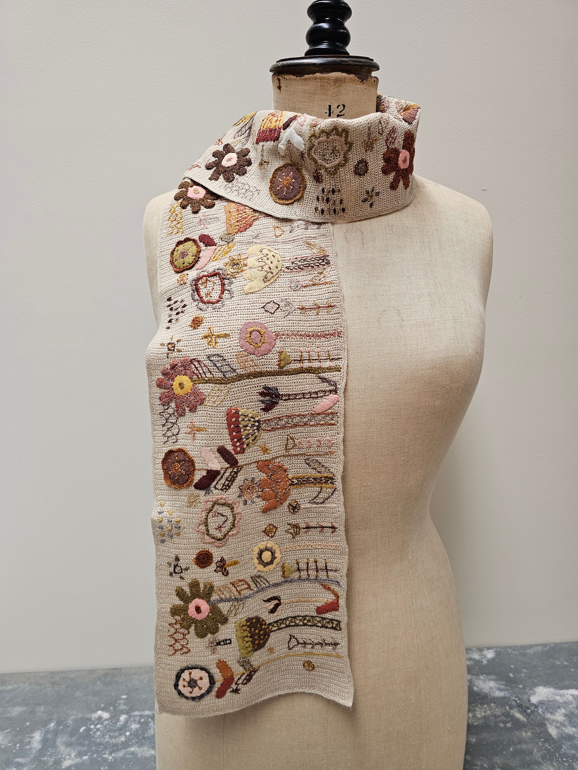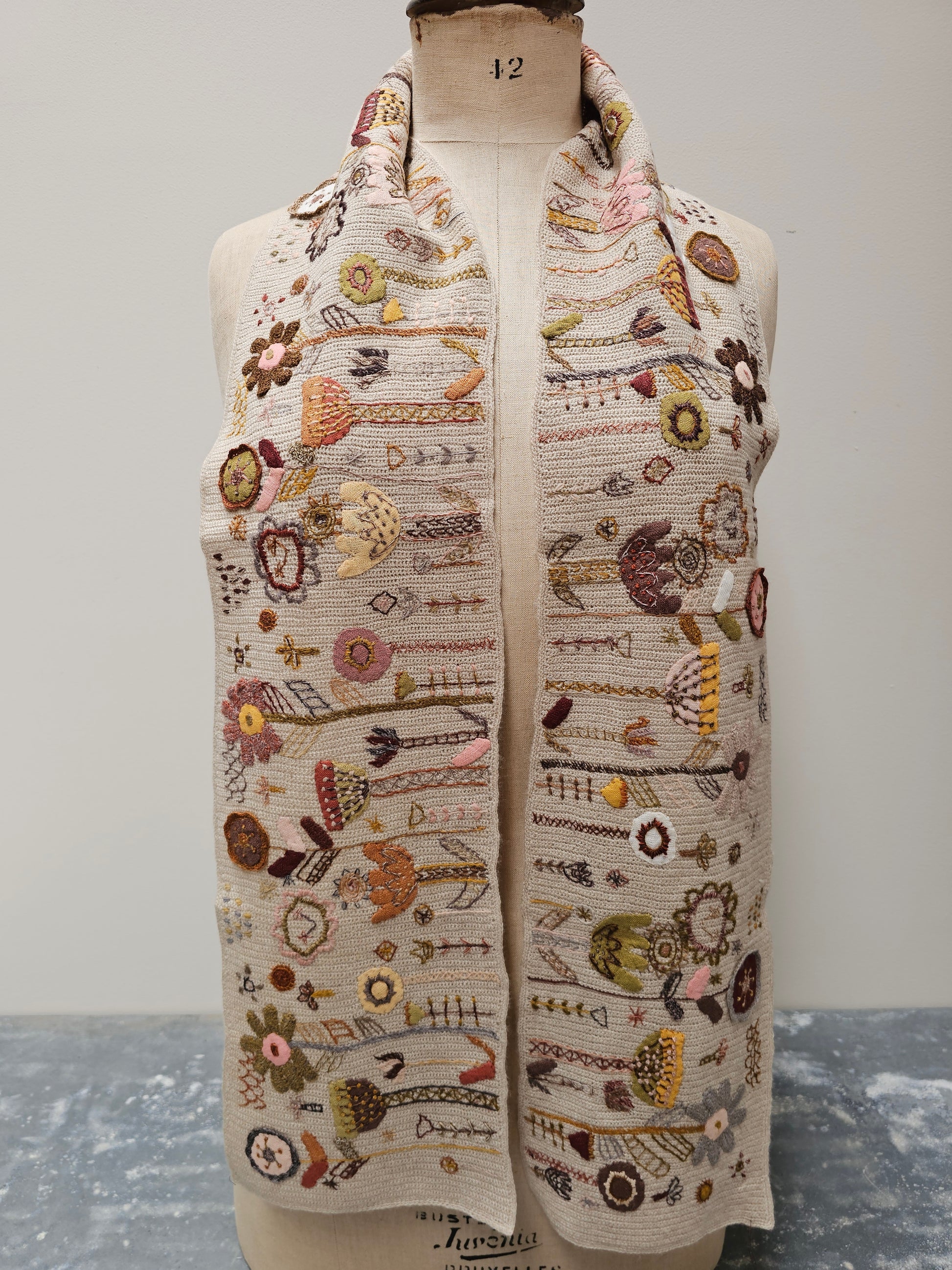 Sophie Digard Garden Scene Crochet Wool Scarf. Beautiful garden scene design with applique linen and wool crochet flowers in shades of pink, burgundy, plum, blue, green and yellow, on an oat coloured wool background.