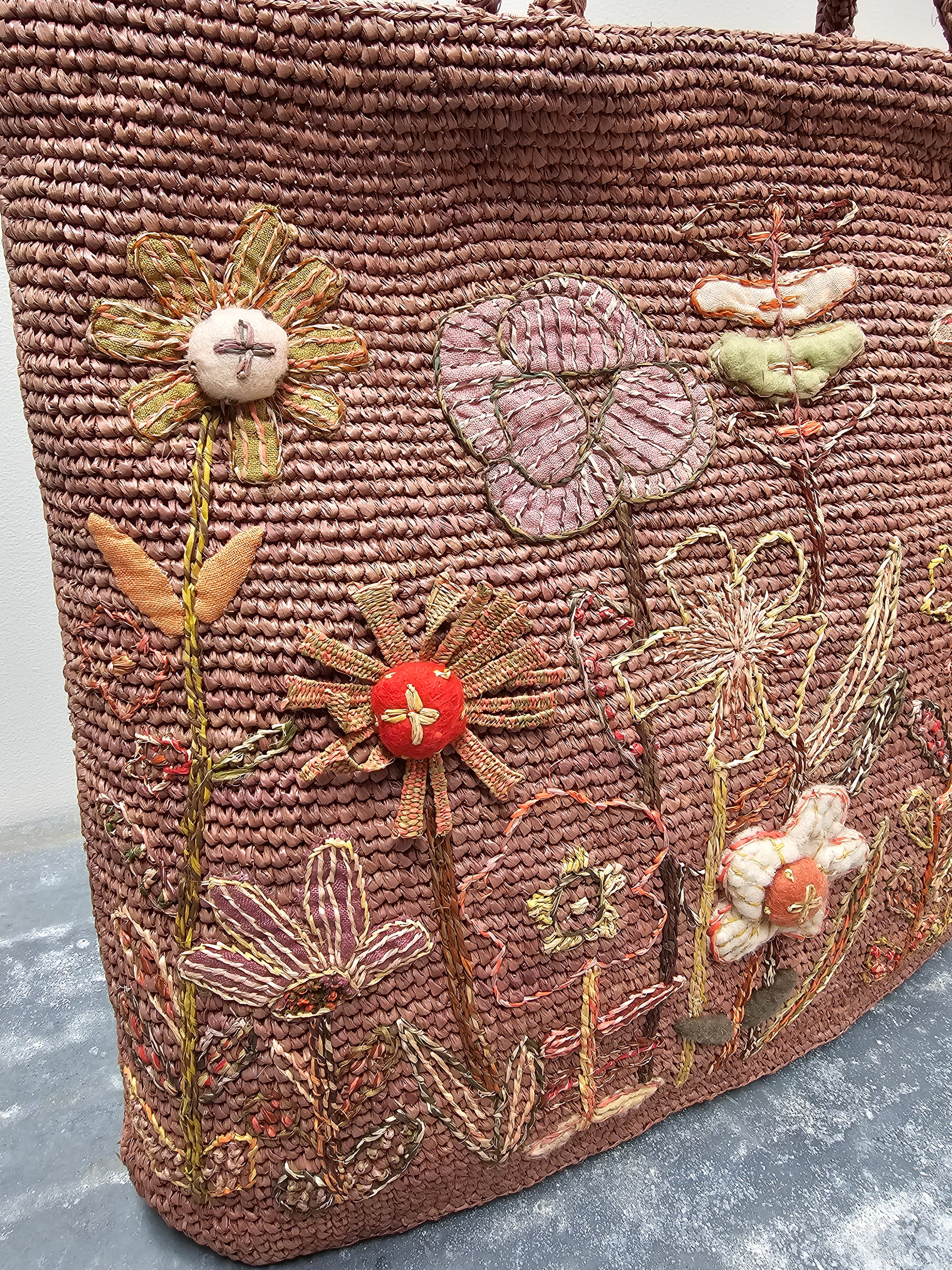 Sophie Digard large pink raffia bag. Gorgeous applique and embroidered flower garden design. Small interior pocket, tie closure and tote bag handle.