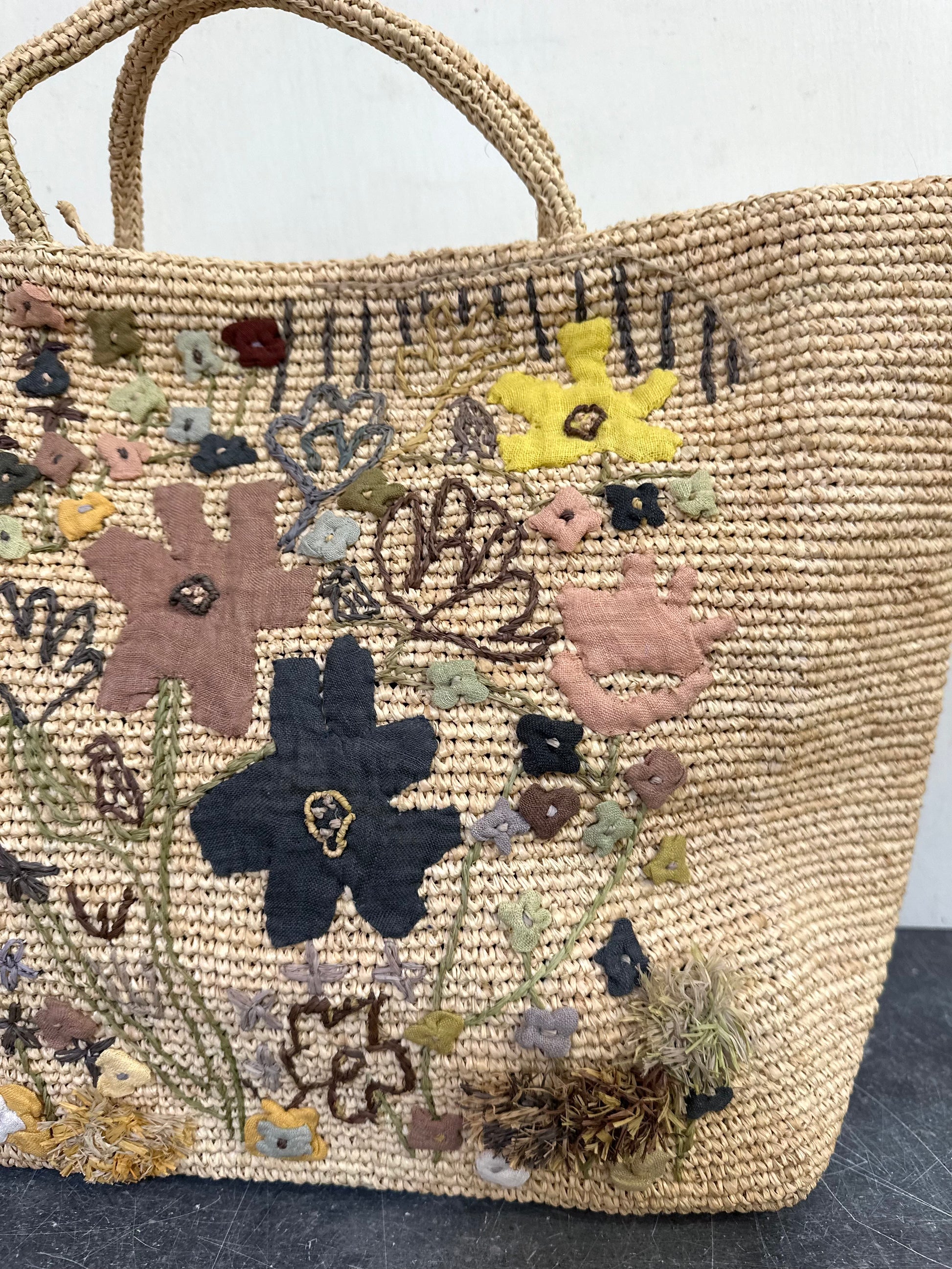Sophie Digard Large Sized natural raffia bag. Multi-Coloured pastel floral applique design with raffia stitching on front of bag. Squared out base, small interior pocket and tie closure.