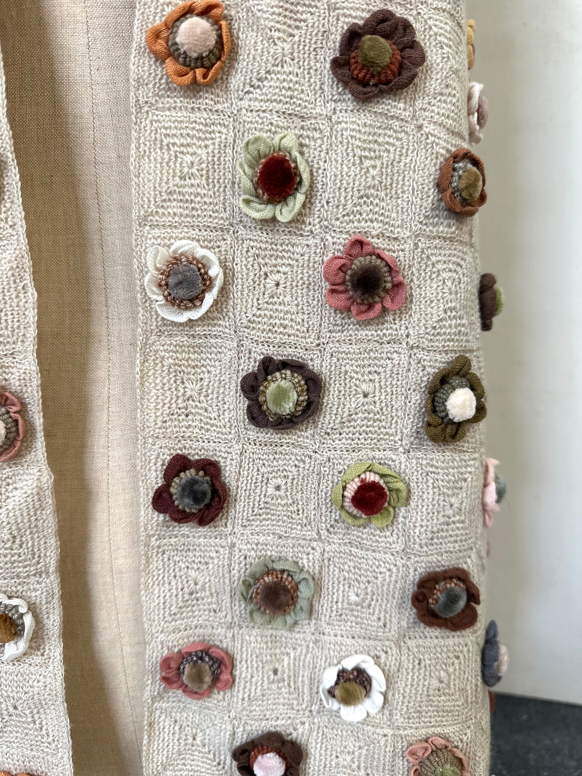 Sophie Digard crochet scarf in geometric check pattern. Beautiful multi-coloured detailed wool and linen flowers in various, pinks, greens, blues and yellows on a gorgeous light sand background.