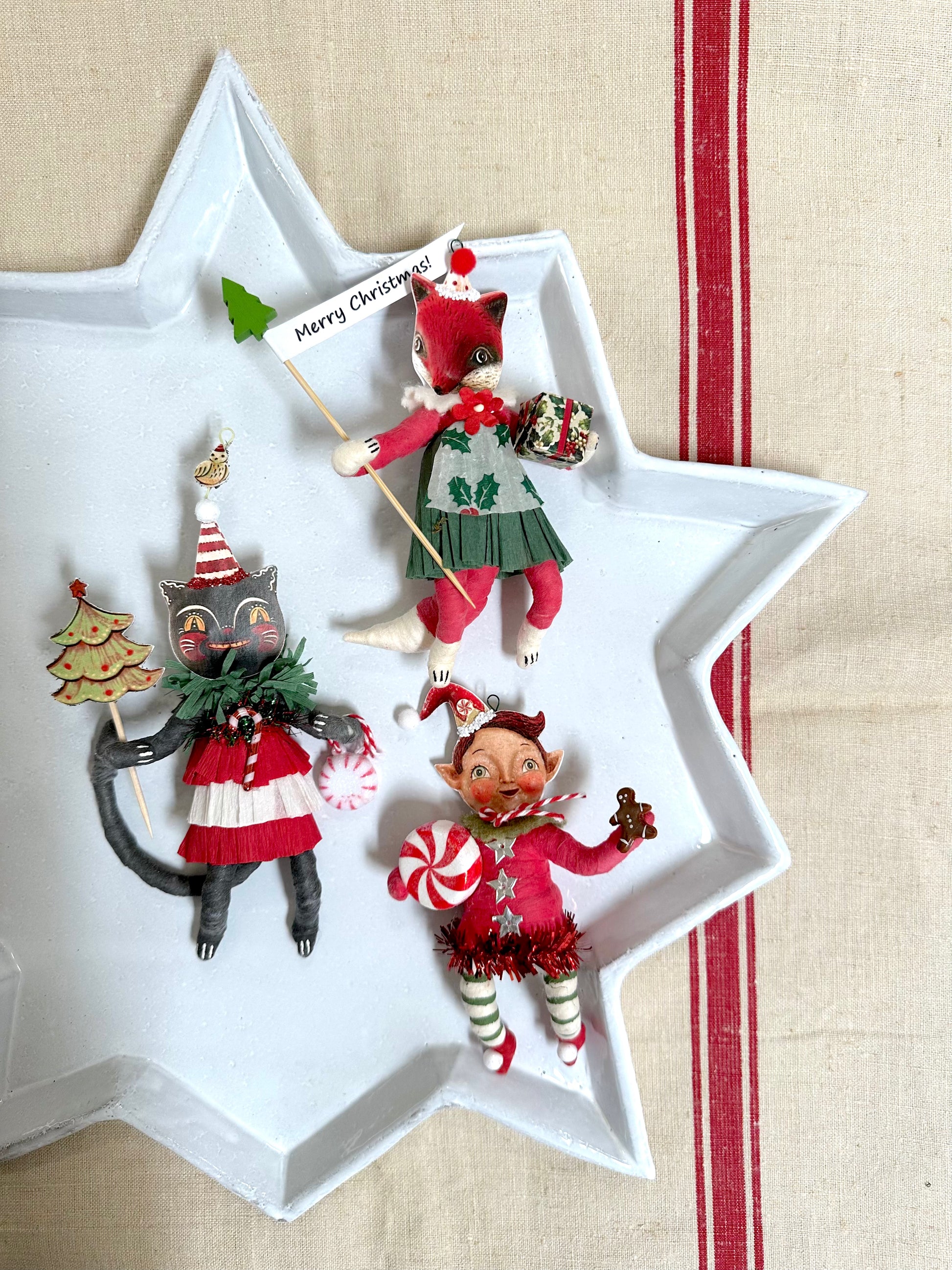 Vintage by Crystal is a husband and wife crafting team that creates a whimsical world of vintage inspired spun cotton figures and ornaments in their home studio in New York. Each piece is carefully handcrafted using a wide range of materials other than spun cotton, including forest floor finds, old antiques and forgotten treasures.