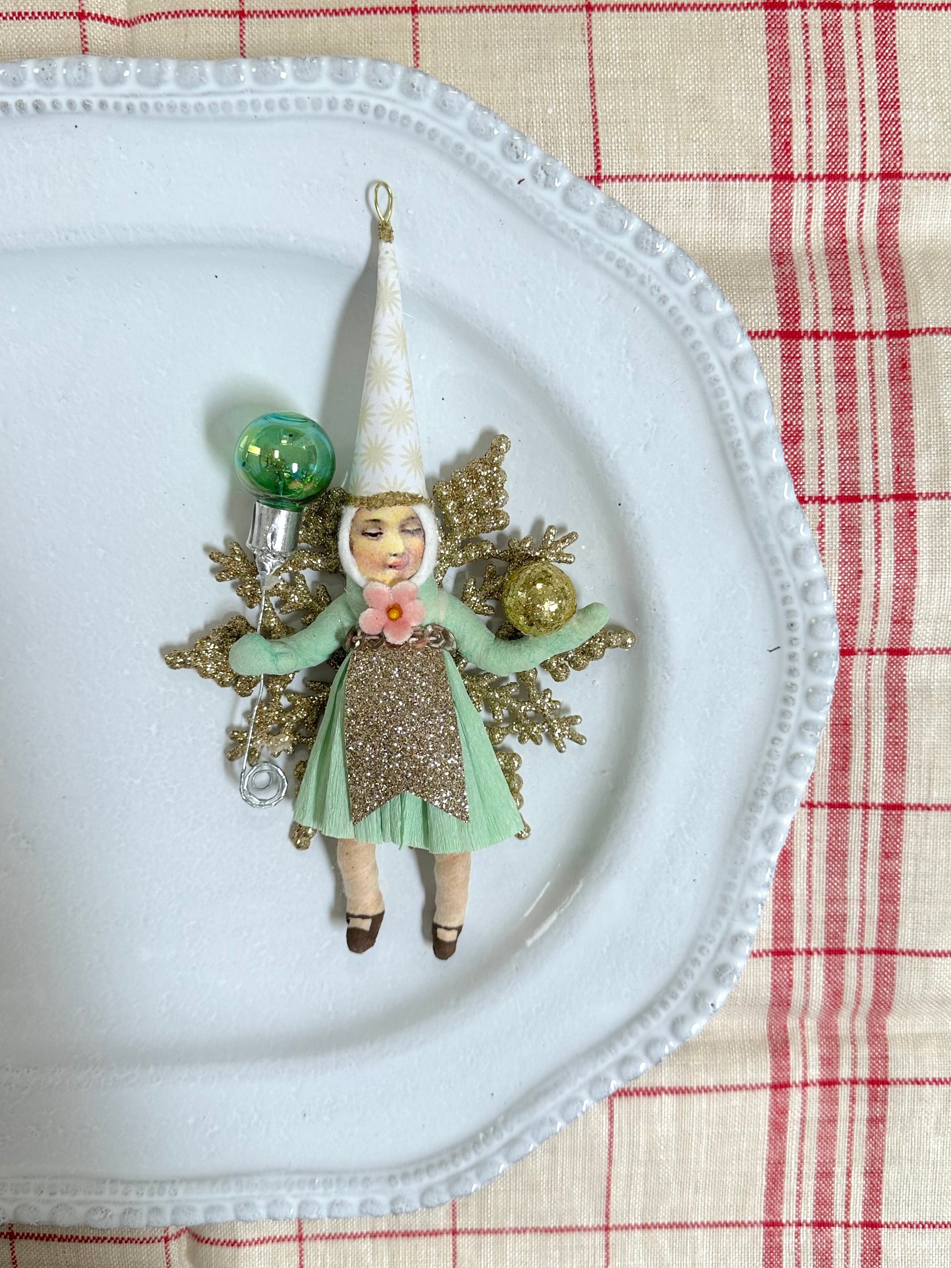 Vintage by Crystal is a husband and wife crafting team that creates a whimsical world of vintage inspired spun cotton figures and ornaments in their home studio in New York. Each piece is carefully handcrafted using a wide range of materials other than spun cotton, including forest floor finds, old antiques and forgotten treasures.