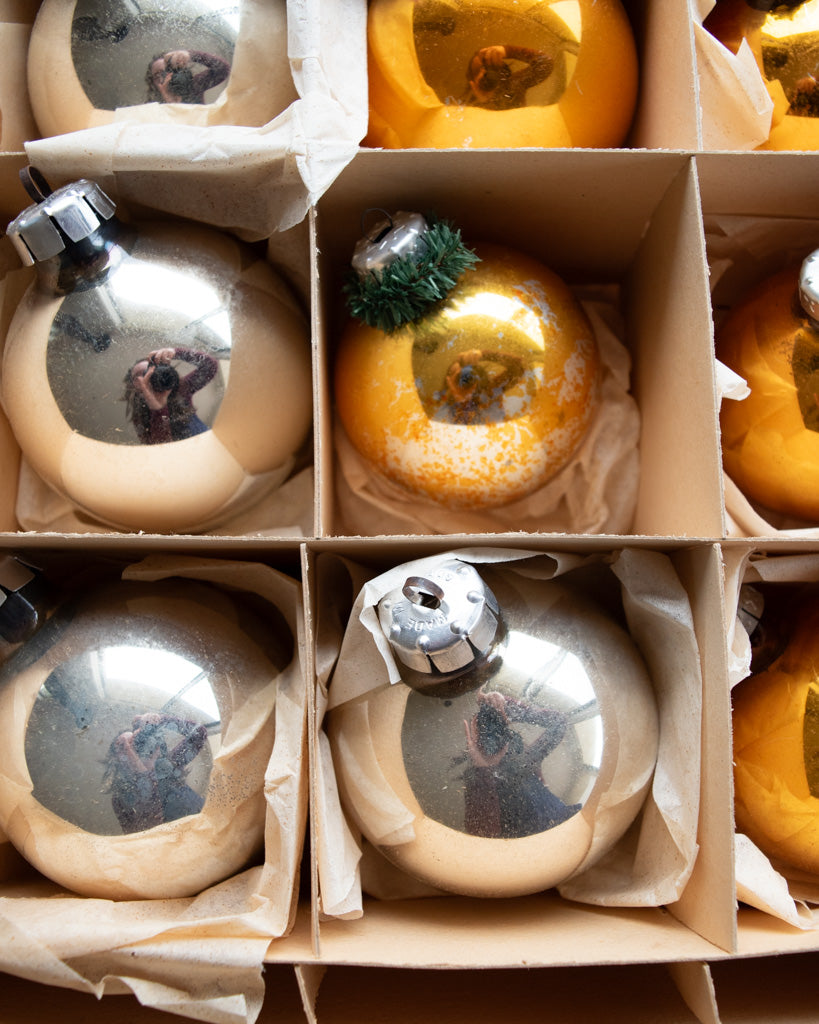 Set of 12. All in a large vintage carboard box with stapled corners. 5 large silver baubles, 1 large gold, 6 medium gold baubles. Assorted tops, some stamped with 'Made in DDR' (East Germany)