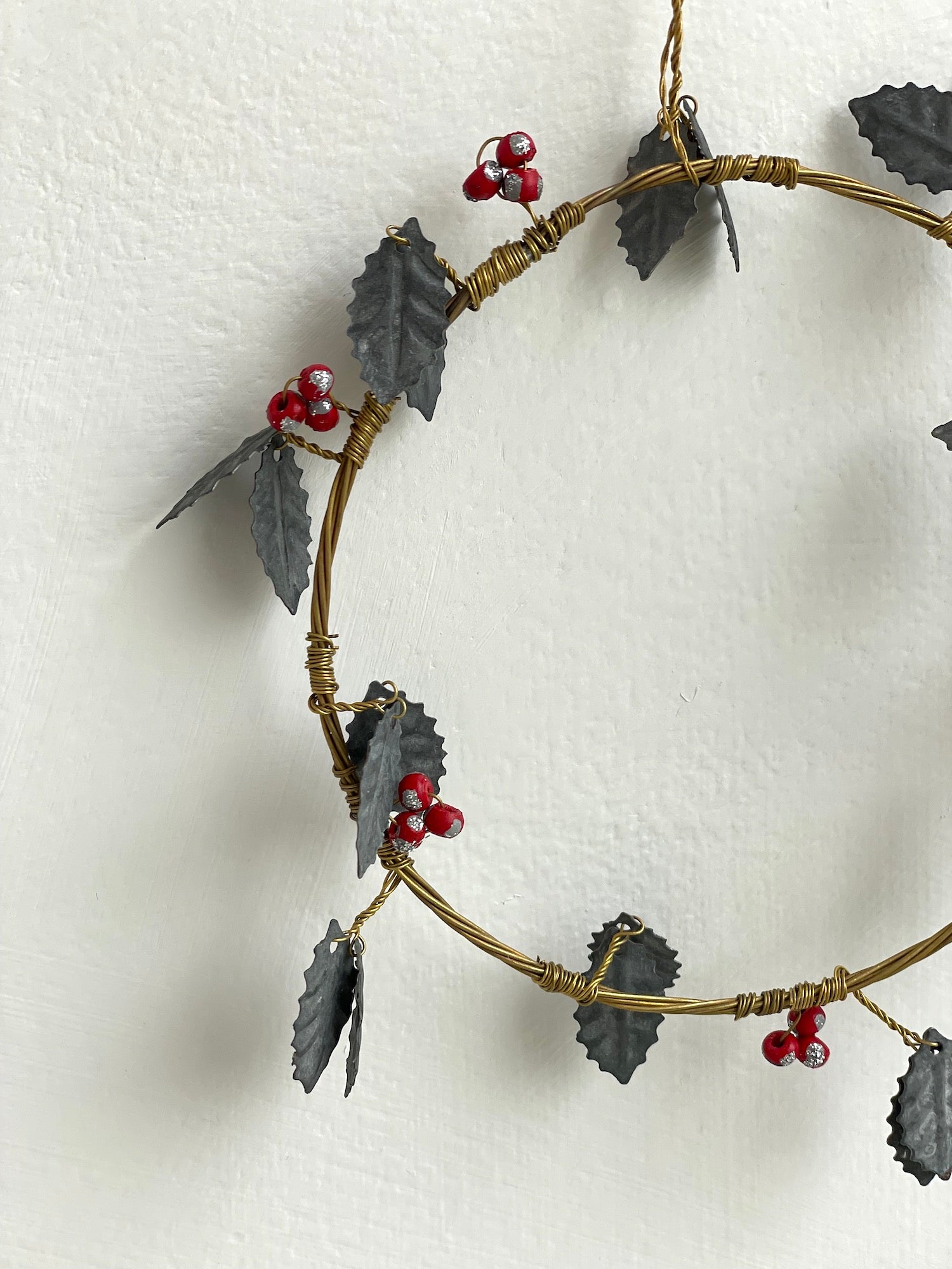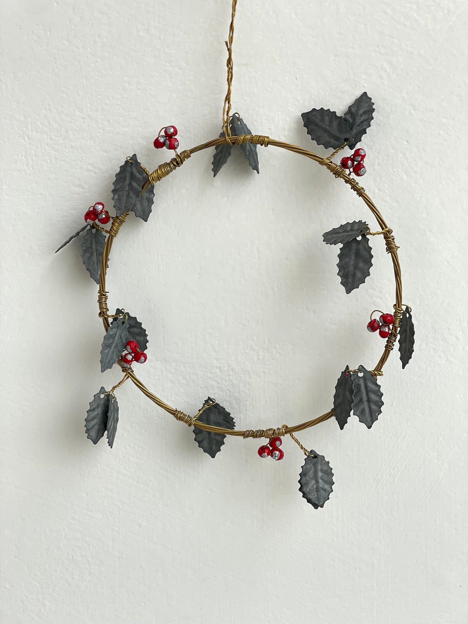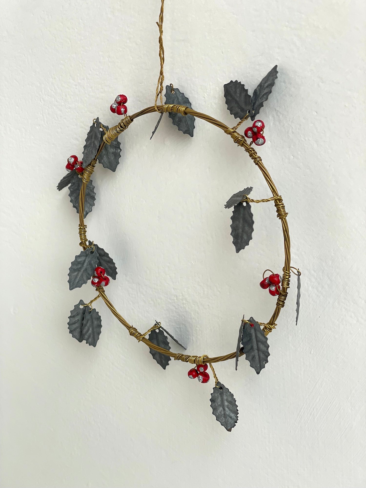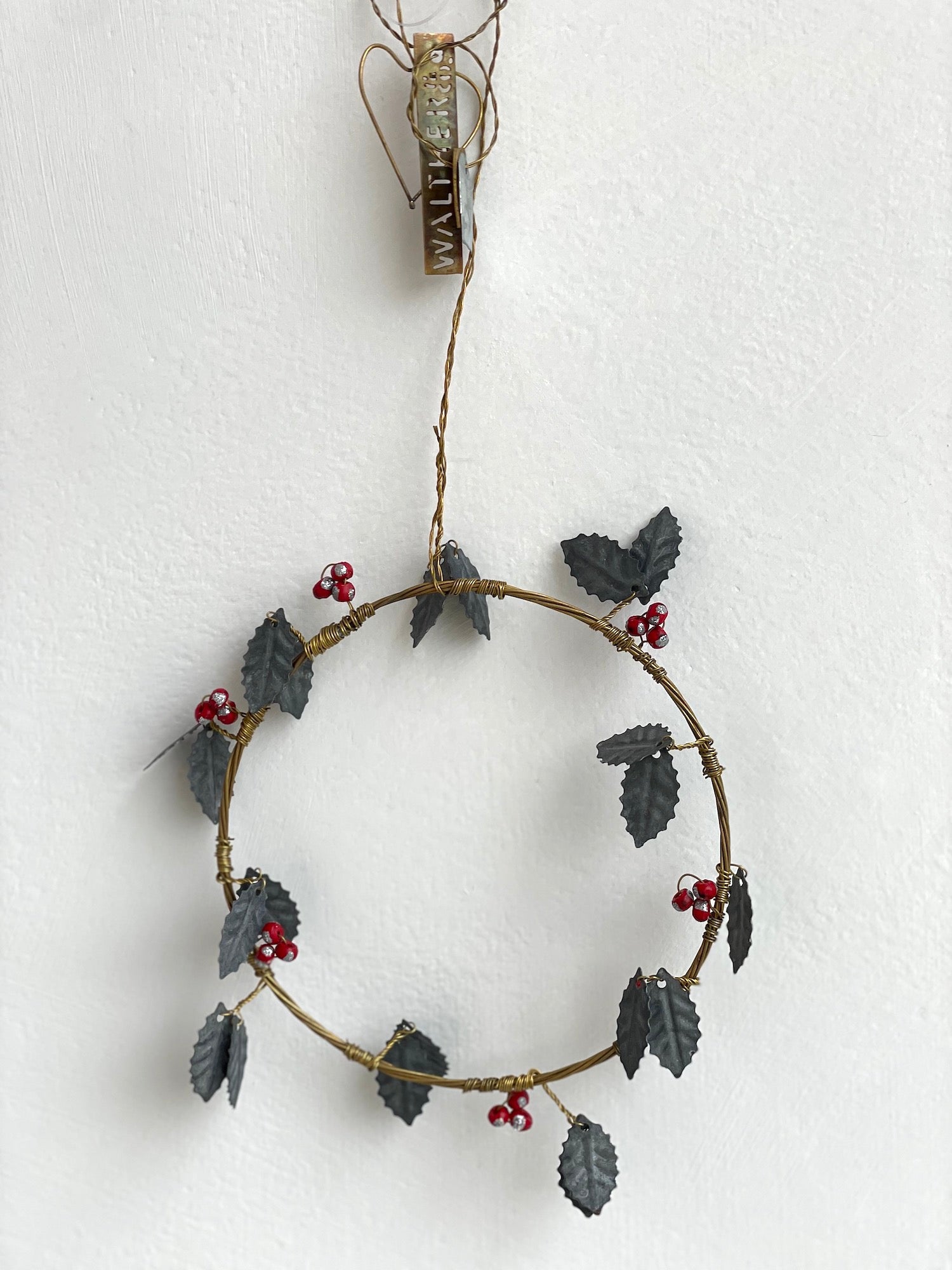 Walther & Co. Pressed metal and wire ornament, holly wreath design.